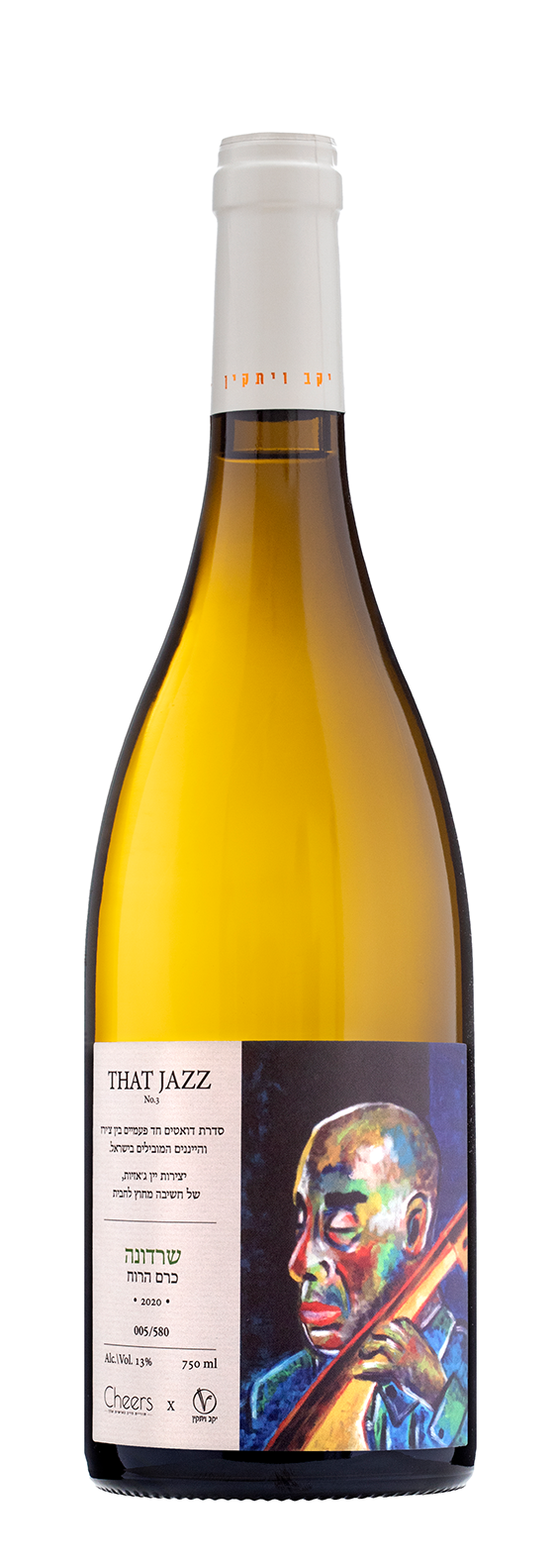 במובן הזה, השרדונה הנדיר שלפניכם משלב את שני הפנים הללו באופן נפלא. מחד, הכבוד שרוחש אסף לשרדונה, במיוחד כשהוא מגיע מטרואר משובח כמו כרם הרוח בגולן, 940 מטר מעל פני הים, בטיפולו של כורם חרוץ כמו עידו בר ממרום גולן, ומאידך הפרשנות המיוחדת והמרתקת של אסף, אחד היוצרים האיכותיים והמקוריים ביותר עם זני הים התיכון. התוצאה היא שרדונה שמתקיים בתווך שבין שני קטבים: מבנה ברור, מרקם עשיר ומורכבות מחד, מול רעננות, איפוק ודיוק מינרלי מאידך. היין תסס והתבגר במכל ובחבית אלון צרפתית של 500 ליטר במשך תשעה חודשים, ולאחריה התיישן עוד כשנה וחצי בבקבוק, על מנת להגיע לנקודה בה רוב המורכבות שבו תתחיל לבוא לידי ביטוי. זהו יין נדיר שיוצר במהדורה מוגבלת של כ- 550 בקבוקים עבור צ'ירז בלבד ונעשה באופן חד פעמי בבציר 2018. התווית האמנותית הנפלאה של המעצב איתמר גור מיטיבה לתפוס את השילוב שבין אֻמָּנוּת לאָמָּנוּת, יין וג׳אז, ואת יחסי הגומלין שבין החושים המשלימים; חושי הטעם, הריח והראייה. אנחנו בצ׳ירז כמובן גאים להציג לכם את יצירת הביכורים הנפלאה הזו.